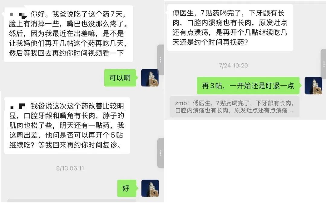 七帖过后,脸部水肿渐消,疼痛减轻,出血缓解,食量增加... 过去三个月放疗所致副作用几已消除。在接下来的治疗中,基本保持上述用药思路不变,在以升降散排出病机的基础上,根据当时身体实际情况,辅以姜半夏、葛根、内金、生地、玄参、石菖蒲、仙鹤草、竹茹、夏枯草、白芷等几味中药的增减,身体状态也一步步改观着: